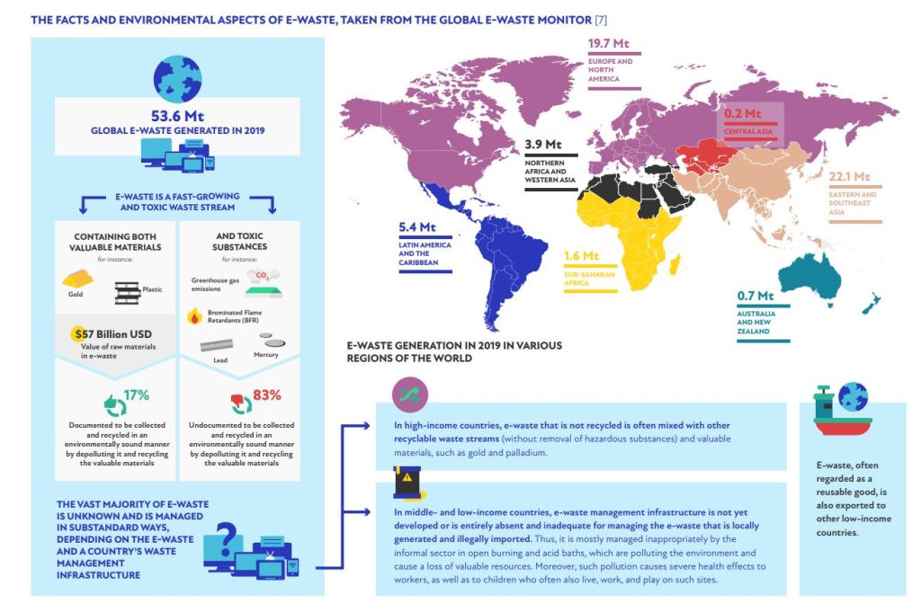 This led to a reduction of 4.9 million metric tonnes (Mt) in the future electronic and electrical equipment waste (e-waste) generated – this is due to the COVID-19 pandemic, especially in the first and second quarter of 2020. The reductions were 30% in low- and middle-income countries and vastly different at 5% in high-income countries. (see report for details).