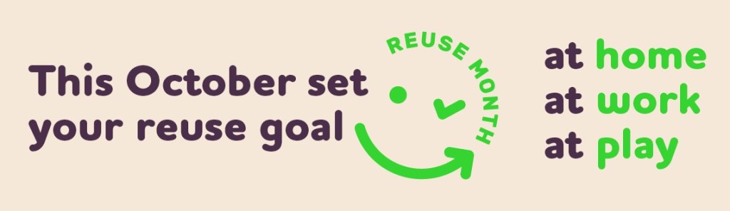 National Reuse Month’s aim is to inspire you and provide you with the skills and tools to reuse more at home, at work and at play. For example, you may have already reused by getting shoes resoled rather than replacing them or borrowing books from the library. To cut down on waste and greenhouse gas emissions, we asked everyone to go further in October and beyond by prioritising repair, buying second hand, and upcycled, borrowing, swapping, and refilling. Click here to learn more.