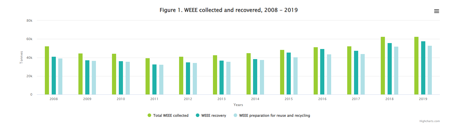 - The data for 2019 shows that 62,600 tonnes of WEEE was collected in Ireland for treatment in 2019, almost identical to the quantity collected in 2018 (62,700 tonnes). In 2019, Ireland achieved a WEEE collection rate of 61% and therefore failed to meet the new 65% target.
