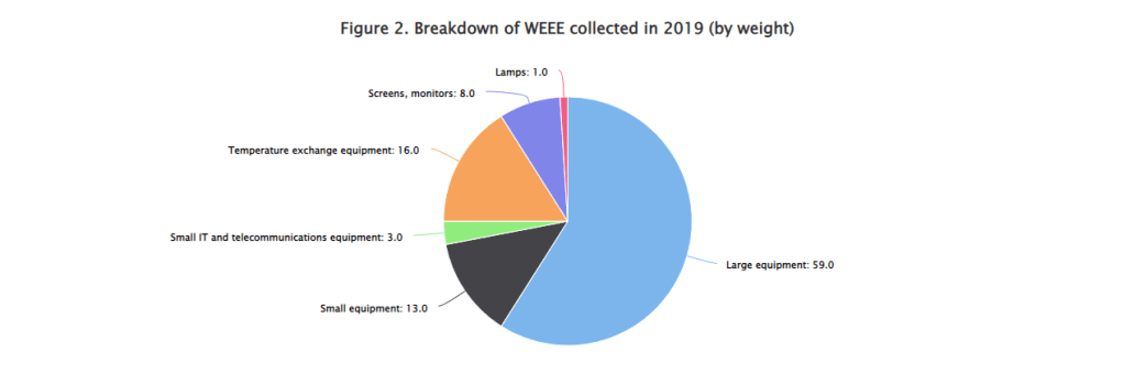 - Large Equipment’ accounted for 59% (by weight) of all WEEE collected in Ireland in 2019. This category includes cookers, washing machines etc.
