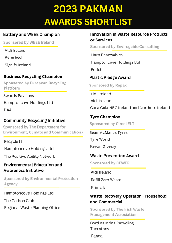 Repak has announced the finalists of the 2023 Pakman Awards. The Pakman Awards are Ireland’s leading environmental and sustainability awards and recognise excellence in recycling and waste management among Ireland’s businesses, organisations, community groups and local initiatives.