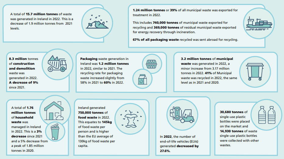 Ireland is generating excessive waste, reaching a total of 15.7 million tonnes in 2022. Addressing this requires system-wide change to accelerate the transition to a circular economy. Stronger regulation, incentives, and enforcement are needed to encourage industry, businesses, and consumers to adopt more sustainable production and consumption practices.