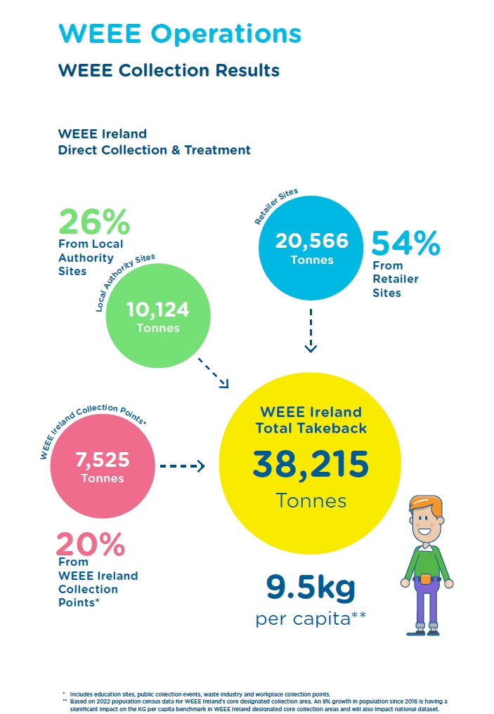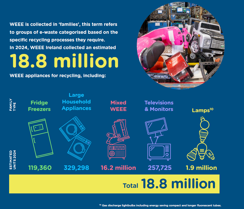 WEEE Ireland manage the collection of household e-waste, lighting and solar PV equipment and batteries from authorised collection points for recycling and recovery, on behalf of over 1,300 industry members.